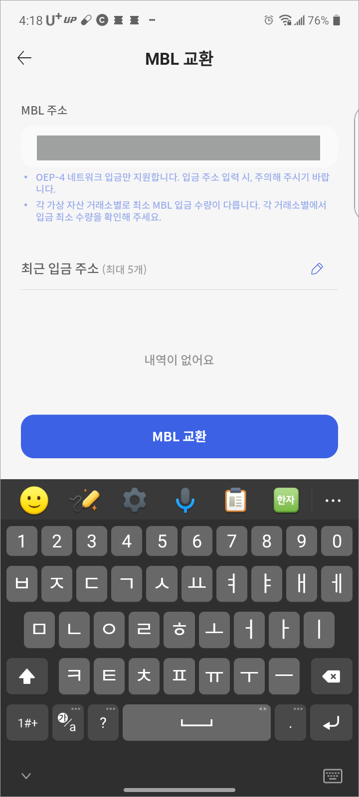 다음 [MBL 입금주소 입력]을 클릭하면, [MBL 주소]를 입력하라고 나옵니다.