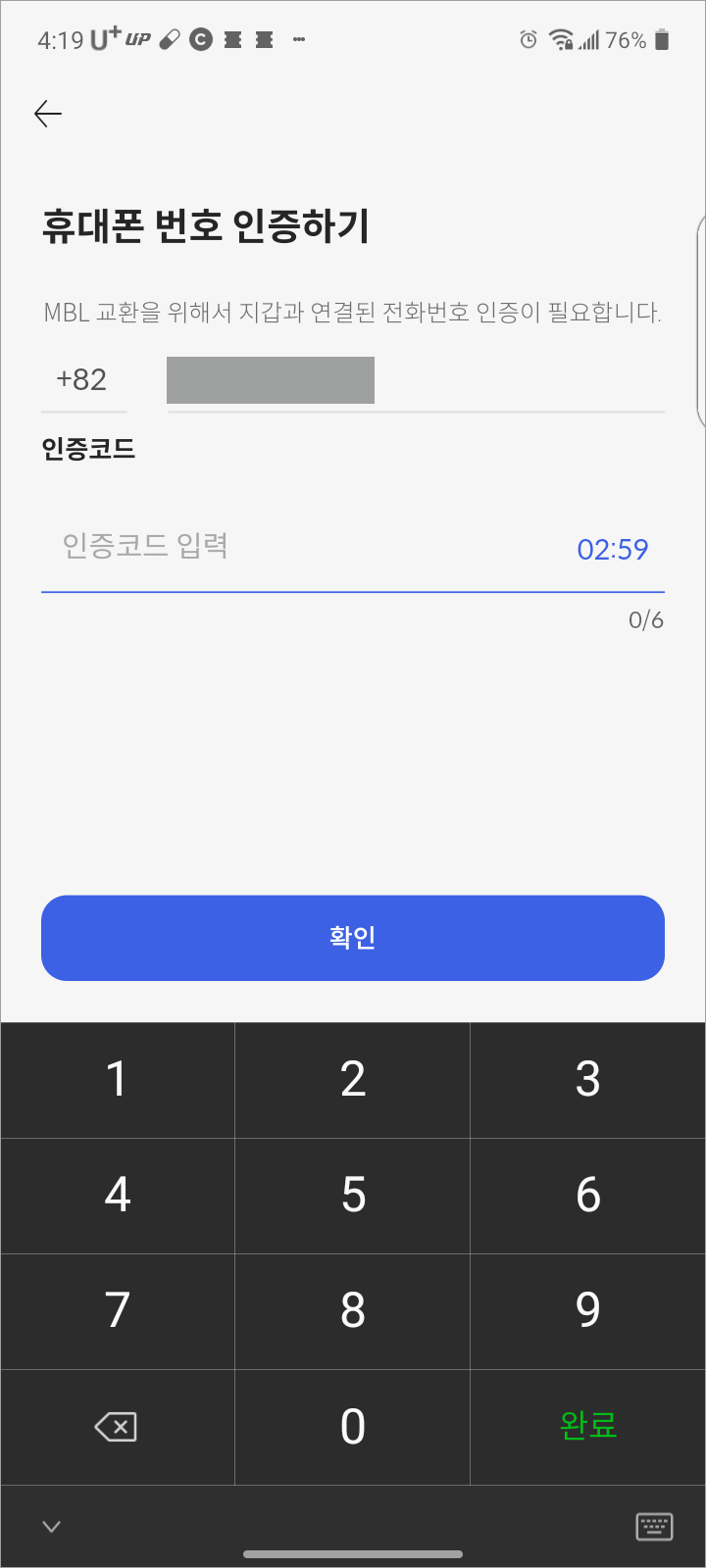 그리고 아래 [MBL 교환]을 누르면, 휴대폰 번호 인증 후, 교환요청이 완료됩니다.