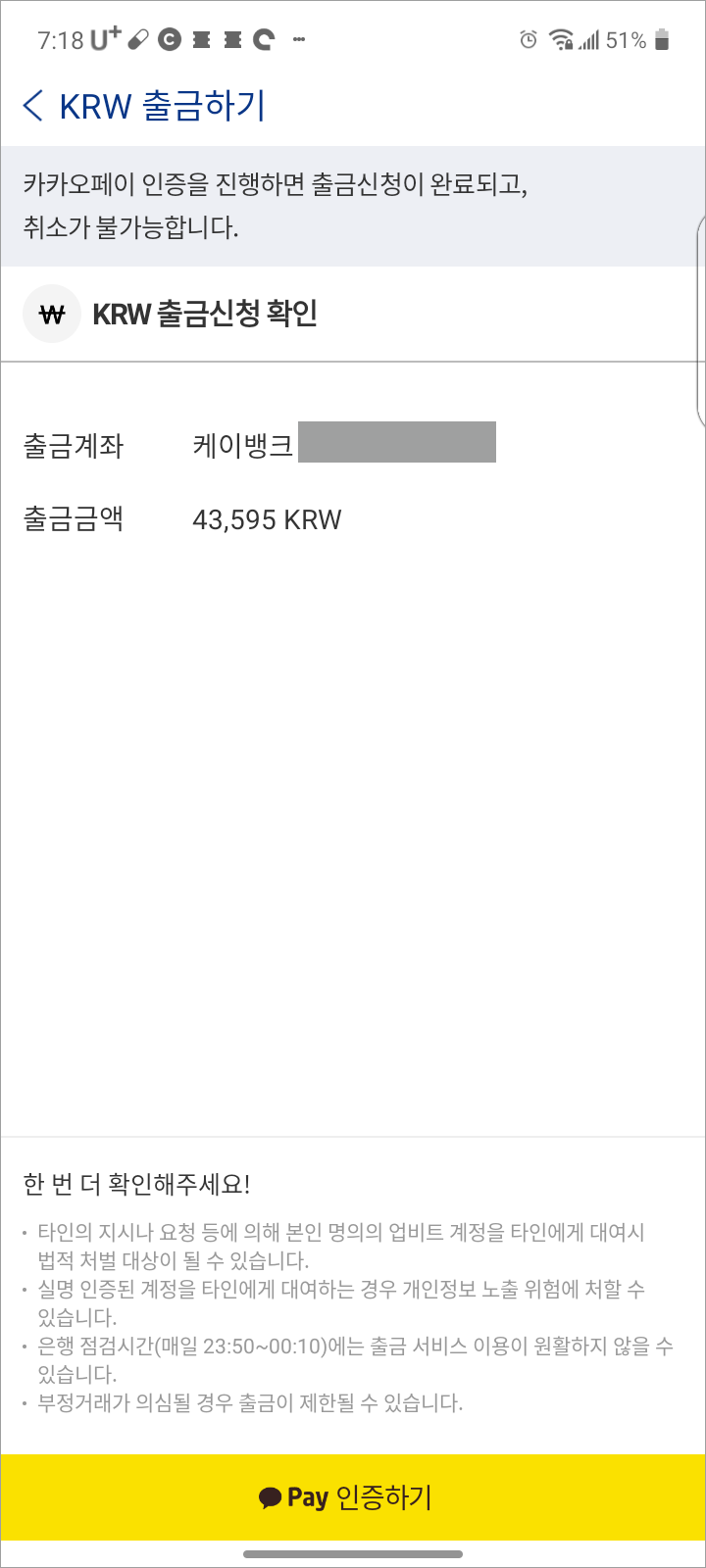 그럼 카카오페이 인증 후 출금신청이 완료됩니다. (취소 불가)