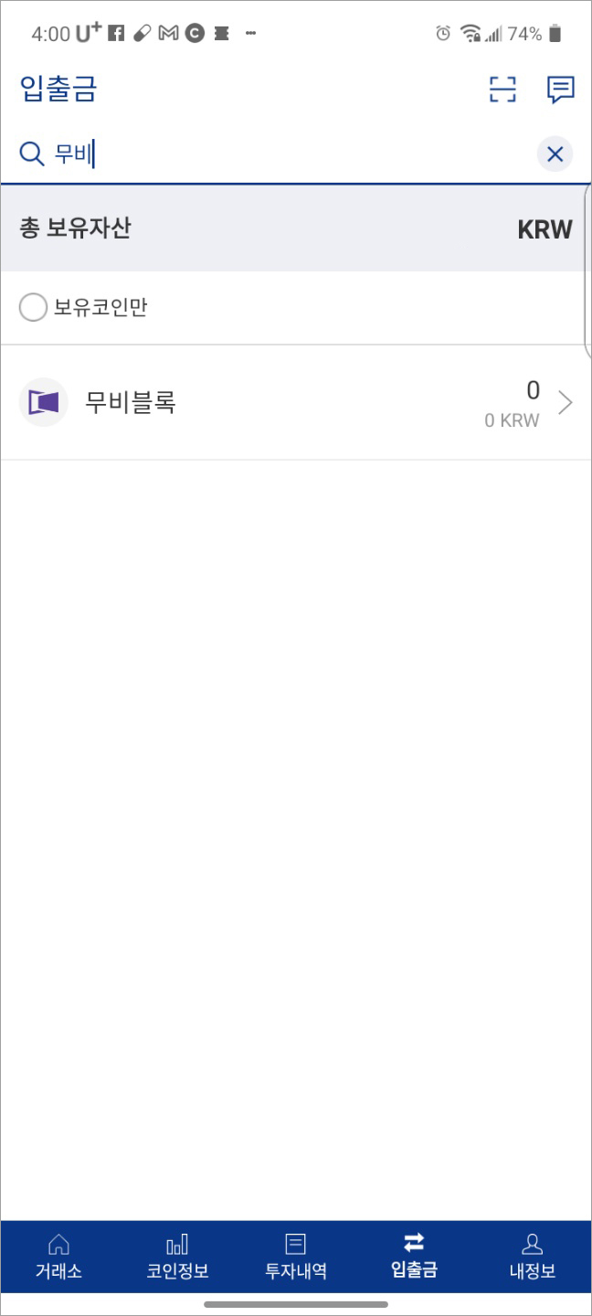 업비트로 가서, 하단 [입출금] 클릭, '무비블록'을 검색합니다.