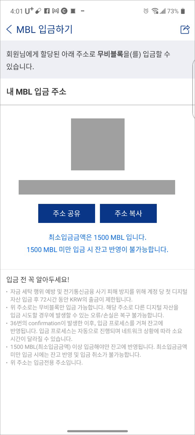 나에게 할당된 이 주소를 사용해서 무비블록코인을 업비트로 입금할 수가 있는 것이죠.