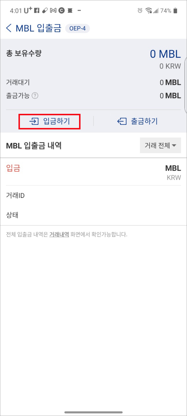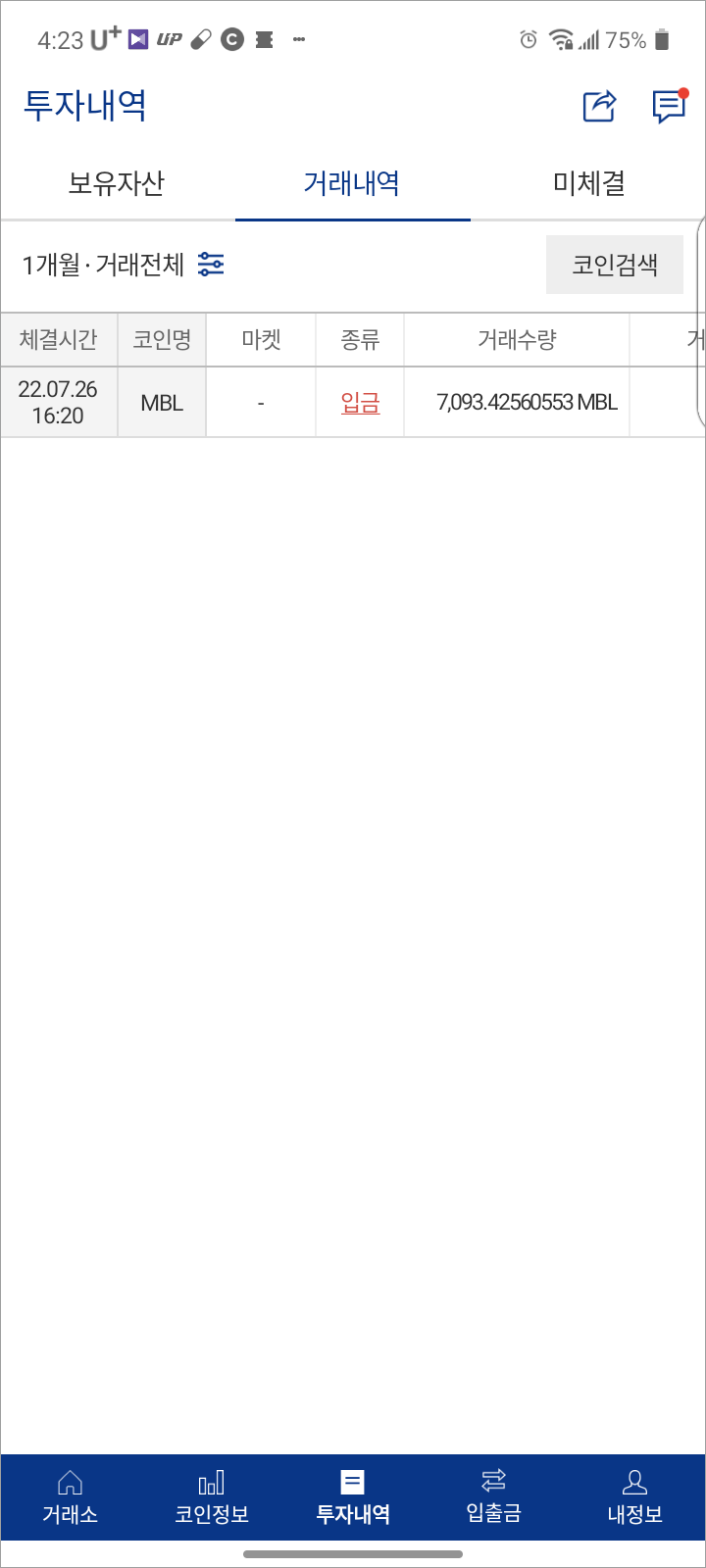 업비트로 가서, 하단 [투자내역]에서 [거래내역]으로 가보면, 아래와 같이 MBL이 입금된 내용이 보입니다.