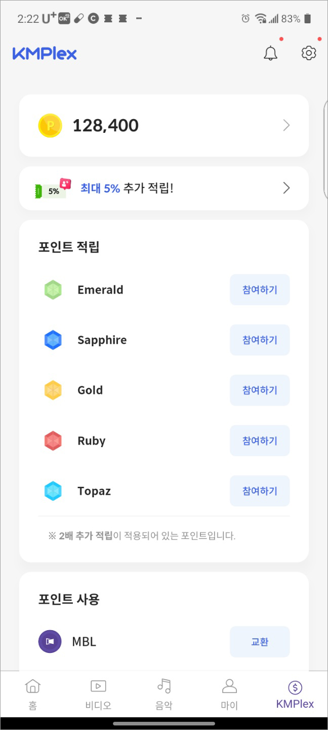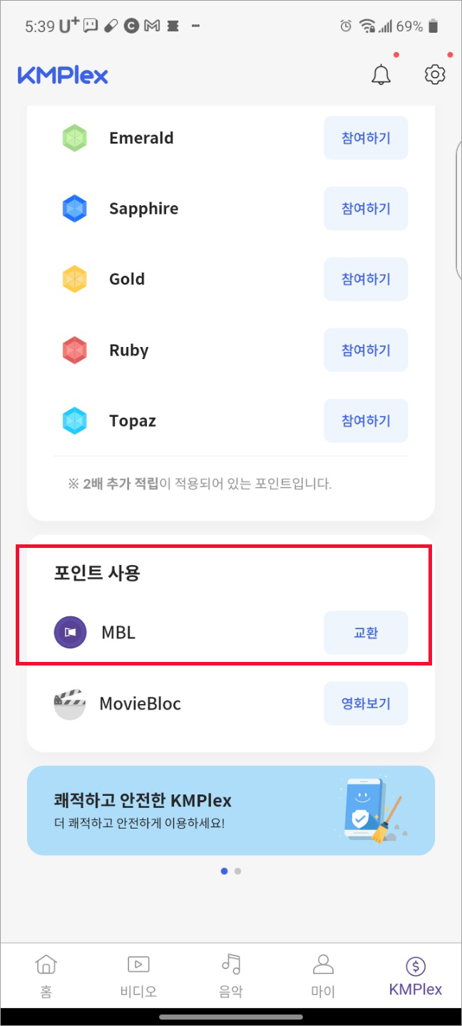 다시 KMPlayer로 돌아가, 모아두었던 포인트를 무비블록코인 MBL로 교환해 줍니다.