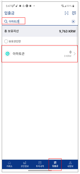 업비트 실행해서, 하단의 [입출금]으로 들어가, 검색창에서 '아하토큰'을 검색하고 들어갑니다.