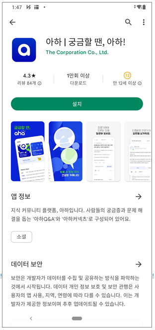 구글플레이에서 아하를 검색해도 되고, 아래 링크로 들어가도 됩니다.